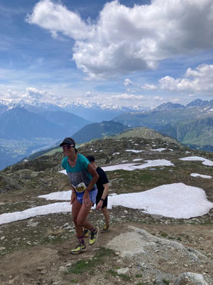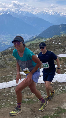 Nun zu etwas ganz anderem. Wegen dem schneearmen und milden Winter bin ich seit Dezember 2022 vermehrt zu Fuss unterwegs. Das Goms ist nicht nur für Skitourengeher, sondern auch für Trailrunner ein absolutes Paradies. Am Anfang war es noch ein Kampf, doch mittlerweile habe sogar ich, als absolute nicht Läuferin, Freude am Laufen entwickelt. Schade erst jetzt, wo Roger wieder vermehrt Probleme mit seiner Hüfte hat, und wir die Trails nicht zusammen laufend unsicher machen können. Mindestens einmal pro Woche erkunde ich laufend das Goms. Mal mit vielen Höhenmeter, dann wieder flowiger und manchmal auch um meine Grenzen zu sprengen. So kam es, dass ich am 14. Mai meinen ersten Marathon gerannt bin. Zusammen mit meinem Freund Bernhard, ins Goms zugewanderter Tiroler, startete ich ab meiner Wohnung in Blitzingen über den Waldweg bis nach Oberwald und auf der anderen Talseite via Gommer Höhenweg wieder zurück nach Blitzingen. Mit 51 km und 1'930 Höhenmetern konnte ich meinen ersten Marathon gesund und glücklich finishen. Wäre ich alleine unterwegs gewesen, hätte ich, ehrlich zugegeben, wahrscheinlich in Reckingen abgebrochen. Der lange, mühsame Aufstieg auf der Forststrasse war nach rund 35 Kilometern eine grosse mentale Herausforderung für mich. Sobald ich keinen Trail mehr unter den Füssen habe, wird es mir wahrscheinlich langweilig und die Motivation sinkt. Zum Glück konnte ich dieses Tief wieder überwinden und meine Teufelchen überlisten. Aufgeben ist immer einfach, umso schöner konnte ich es durchziehen und mental wieder etwas wachsen.
