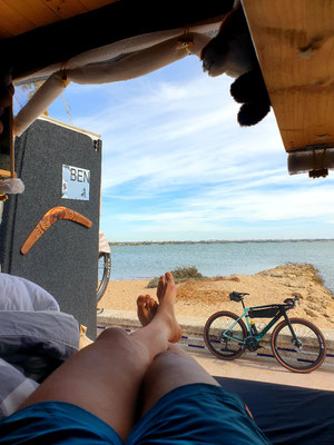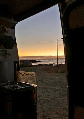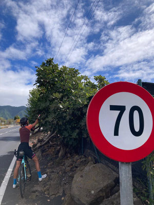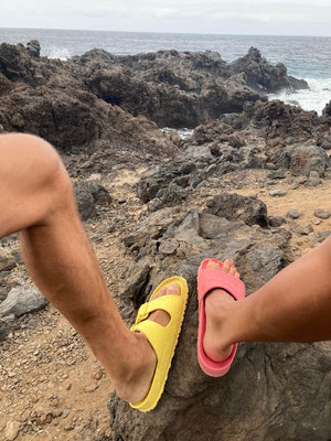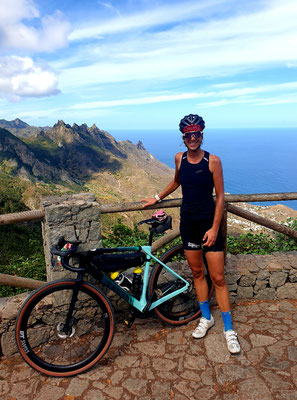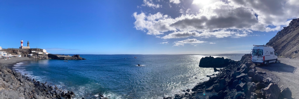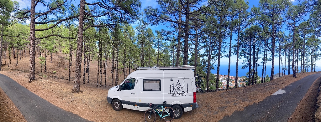 An Bord habe ich mich übers WLAN bereits nach einem ersten Schlafplatz erkundet, doch zuerst muss ich Sämi wieder volltanken. Ich habe Sämi am Festland extra nicht mehr getankt, weil ich noch von unserer Reise auf die Kanaren während unserer Auszeit wusste, dass dort der Diesel nur ca. 1 Euro pro Liter kostet. Zum Glück ist es immer noch so und ich steuerte die günstigste Tankstelle in der Nähe des Hafens an. Wie immer bin ich in Städten überfordert. Aufs Handy schauen wo ich durch muss, den Verkehr im Auge behalten und die mir nicht geläufigen Verkehrsregeln. Mehrmals unternehme ich haarsträubende Wende- und Abbiegemanöver, winke den anderen Verkehrsteilnehmern jeweils dankend zu. Zum Glück sehen die ja, dass ich Touristin bin und keine Ahnung habe. Schweissgebadet vom Städte- und Fahrstress erreiche ich das kleine Hafendorf San Andres und meinen ausgewählten Übernachtungsplatz. Ich mache mir einen Kaffee, esse ein frisches Croissant und mache mich für meine erste Erkundungstour mit meinem Gravel parat. Über wenig befahrene Strassen erkundige ich den Norden der Insel und geniesse das milde und sonnige Wetter. Am Abend kühle ich mich bei einem Schwumm im Atlantik ab. Meine erste Nacht auf den Kanaren verläuft ruhig und ich lasse die Schiebetür von Sämi offen, damit frische Luft zu mir in meine "Räuberhöhle" dringen kann.
