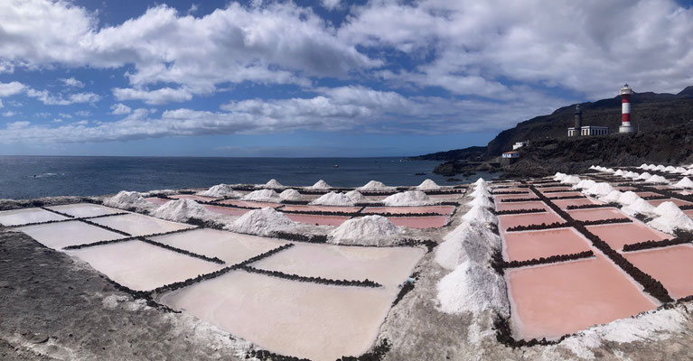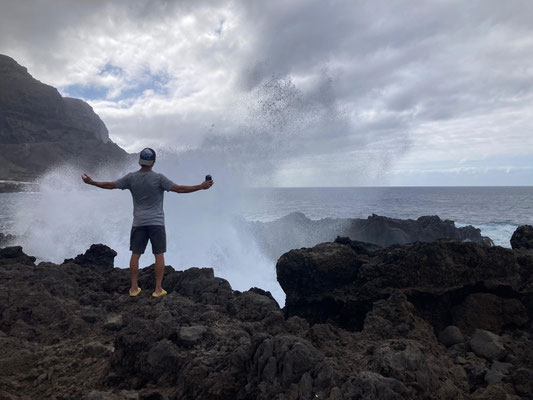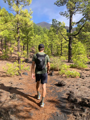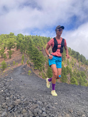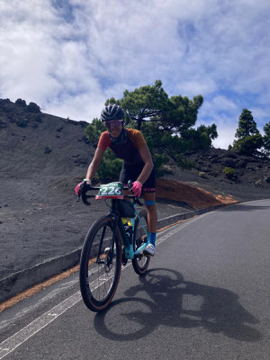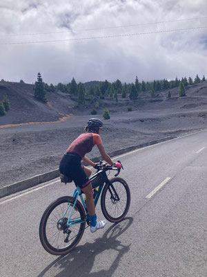 Auch La Palma haben wir vor vier Jahren auf unserer Reise besucht. Jedoch war damals ein grosser Teil der Insel wegen des Vulkanausbruchs gesperrt. Deshalb fahren wir nach unserer Ankunft als erstes an das südliche Ende der Insel wo wir für die ersten zwei Nächten einen einsamen Platz direkt am Meer finden. Es windet wie bei uns in der Dorna auch hier den ganzen Tag. Die Umgebung ist schwarz und rau von alten Lavasteinen. Das Peitschen der Wellen wenn sie auf die Brandung treffen sowie der Wind welcher an Sämi rüttelt - ein unglaublich schönes Gefühl - inmitten der Natur die Freiheit des Nomadenlebens geniessen zu können. Wir erkunden die Gegend auf dem Velo und machen eine Wanderung in der Vulkanlandschaft. Das Hochlaufen ist auf dem Lavasand anstrengend, umso cooler beim Runterlaufen. Da können wir knieschonend im sandigen Boden runterrennen.