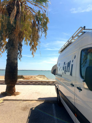 Todmüde fallen wir kurze Zeit später gemeinsam ins kuschelige Bett in unserem Sämi. Schön, nach einer Woche allein sein, wieder mal Roger an meiner Seite zu haben. Zum Frühstück gibt es ein leckeres Croissant, welches ich in einer örtlichen Bäckerei finde. Nach dem Frühstück heisst es erstmal Lebensmittel shoppen. Da ich aktuell arbeitslos bin und kein Geld verdiene, habe ich mir für die zwei Monate on the road ein Tagesbudget von CHF 5.00 gesetzt. Natürlich ohne die An- und Rückreise, ohne die Fähren von Insel zu Insel und ohne Diesel. Deshalb freue ich mich natürlich, dass Roger mir während den zwei Wochen ein "Upgrade" bezahlt. Er lädt mich immer wieder zu Cappuccino und Gipfeli ein und übernimmt die Kosten beim Einkauf der Nahrungsmittel. So kann ich aktuell meine CHF 5.00 pro Tag sparen und dann für meine 6 Wochen, wo ich wieder alleine bin, aufsummieren! Durch unsere vielen Reisen nach Spanien weiss ich mittlerweile, in welchen Läden es welche Lebensmittel zu den günstigsten Preisen gibt. Und da wir beide sehr unkomplizierte Esser sind und nur wenig brauchen um glücklich zu sein, halten sich die Kosten für die Ausgaben von Lebensmitteln in Grenzen.