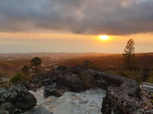 Wir finden einen schönen Platz bei einem Aussichtspunkt an der Strasse in Richtung Teide. Das Café beim Aussichtspunkt ist geschlossen und wird wohl, so wie es ausschaut, auch nicht wieder öffnen. Dementsprechend wenig Touristen besuchen diesen Ort und wir geniessen einen wunderschönen Sonnenuntergang mit Blick auf den Atlantik und die Nachbarinsel La Gomera. Das geschlossene Café ist nicht das Einzige was geschlossen ist. Aktuell ist Zwischensaison und viele Betriebe haben noch oder sind bereits wieder geschlossen. Auch fallen uns die vielen Bauruinen auf. An vielen Orten stehen nicht mal zur Hälfte fertig gestellte Häuser und Ähnliches. Viele davon sind bereits von Sträuchern überwuchert und andere, vor allem in der Nähe von Städten sind mit Graffitis übersäht. Auch fällt uns auf, dass viele alte Hotelbunker statt abgerissen zu werden, einfach noch leer rumstehen und in der Nähe neue Gebäude aus dem Boden gestampft werden. Viele Küstenbereiche sind übersäht von Bauten, es gibt nur wenige Stellen in Meeresnähe, welche noch nicht von Menschenhand zerstört wurden. Ganz übel ist die Gegend rund um Los Cristianos und Las Americanos. Dort wimmelt es von "fetten" Touristen aus England und Deutschland. Was besonders weh tut sind die "grünen" Golfplätze welche in der sonst sehr kargen Landschaft herausstechen. Denn geregnet hat es seit ich auf den Kanaren bin, noch nie. Es ist furztrocken und ich frage mich immer wieder, woher die das Wasser nehmen und wie lange die Menschen auf diesen Inseln noch Wasserreserven haben werden? Und die Golfplätze werden täglich mit Rasensprengern gewässert. Und nicht auszudenken wie viel Wasser die tausenden von Touristen täglich in ihren Suiten und Hotelbunkern brauchen?