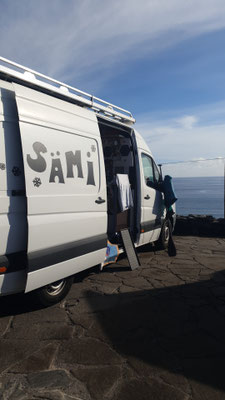 Als ich nach meinem Morgenritual mit SUP und Schwimmen zurückkomme, sehe ich bereits von Weitem, dass die Schiebetür des Schweizer Vans offen ist. Gespannt auf den Besitzer oder die Besitzerin laufe ich zurück zu Sämi. Beim Vorbeigehen grüssen wir uns. Es ist eine Frau und erst noch eine Alleinreisende. Wir kommen sofort ins Gespräch. Ich biete ihr einen Kaffee an und wir machen es uns im Sämi gemütlich. Ist es ein Wink des Schicksals? Wir verstehen uns von Anfang an und sie erzählt mir offen ihre Geschichte. Sie hat im Mai in der Schweiz ihre ganzen Zelte abgebrochen und wollte auf die Insel La Gomera auswandern. Sie hatte bereits vor der Auswanderung ein Jobangebot. Auch den Ort hat sie bereits von vorherigen Reisen gekannt und sie hatte Visionen und Ideen, welche sie bei ihrer Arbeit einbringen wollte. Ihr ging es wie mir. Man sieht wirklich erst richtig dahinter, wenn man für einen Arbeitgeber arbeitet. Vieles war Schein und sie wurde verarscht, nicht ernst genommen und am Ende grundlos auf die Strasse gestellt. Ich fühle bei ihren Erzählungen mit und weiss haargenau wie es sich anfühlt von Menschen, denen man meinte, dass man vertrauen kann, verarscht zu werden. Wenn man Sachen hinterfragt, diese anspricht und keine Marionette ist, ist man schnell ein Dorn im Auge, welcher so rasch wie möglich wieder entfernt werden muss. So sind ihre Träume geplatzt und von einem Tag auf den anderen war sie arbeitslos und das in einem fremden Land, weit weg vom gewohnten Umfeld. Zum Glück hat sie auch einen Bus "Jimmy" - lustig dass die Vans von Frauen meistens einen Männernamen haben! Obwohl Sämi gehört auf dem Papier nur Roger, ich bin eigentlich nur Mieterin ohne Miete bezahlen zu müssen! :-)